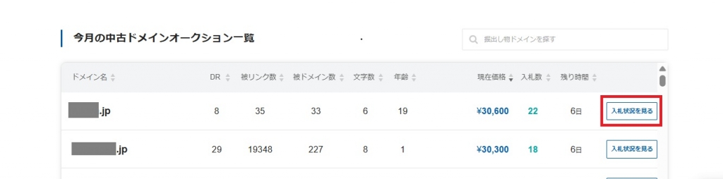 バリュードメインのアカウントにログインし、ドメインオークションページから入札したいドメインの「入札状況をみる」をクリックします。