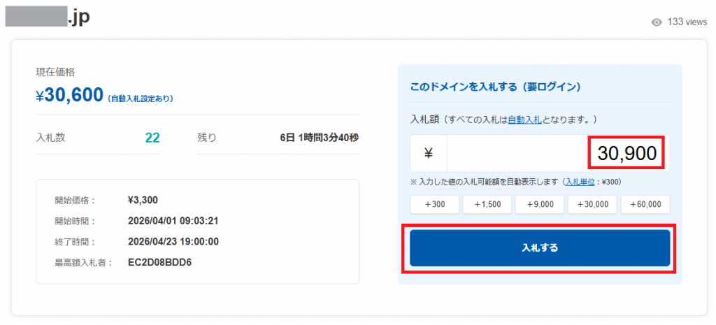 - オークション期間中に希望のドメインを選び、入札額を入力する