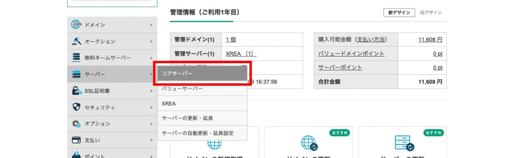 5. バリュードメインのユーザー登録が完了したら、管理画面より「サーバー」>「コアサーバー」をクリックします。