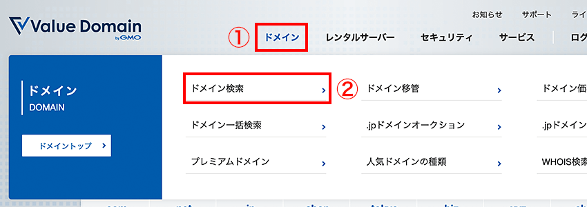 バリュードメインでドメインを取得する手順です。以下の場合は、各マニュアルを参照ください。