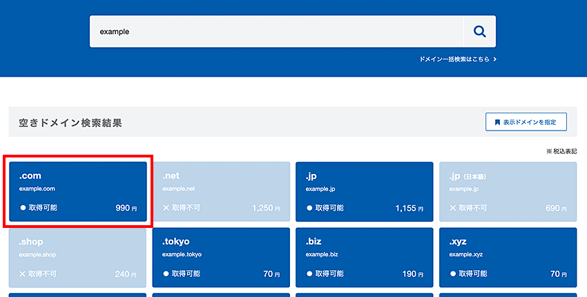 登録可能なドメインは、青色のボタンで「取得する」と表示されます。 登録したいドメイン名が空いていたらクリックできます。