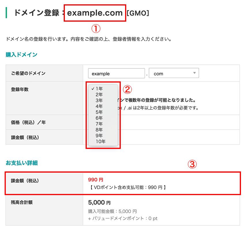 4ドメイン名、登録年数が間違いないかを確認します。