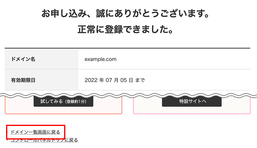 9ドメインの登録が完了しました。「コントロールパネルへ」をクリックします。