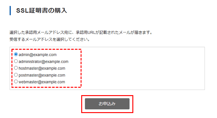 1)承認用メールを受信するメールアドレスを選択し、「お申込み」をクリックします。