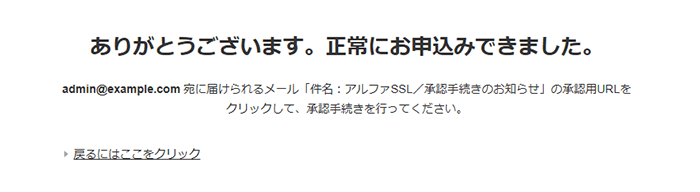 3)選択したメールアドレスに認証メール(件名:アルファSSL/承認手続きのお知らせ:CEDX〇〇〇〇〇(数字))が届いているかを確認してください。