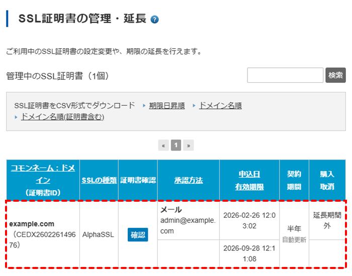 6SSL証明書の管理・延長画面に、申請したSSL証明書が表示されていたら完了です。