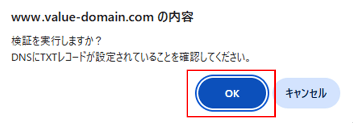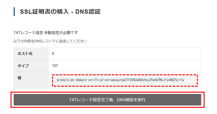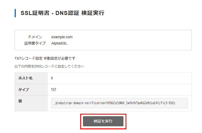 追加後、「TXTレコード設定完了後、DNS検証を実行」をクリックします。