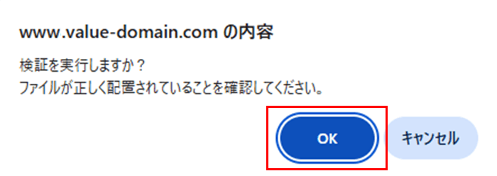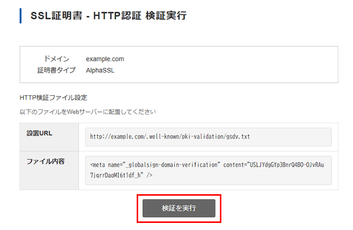 ファイル設置後、「ファイル設置完了後、HTTP検証を実行」をクリックします。
